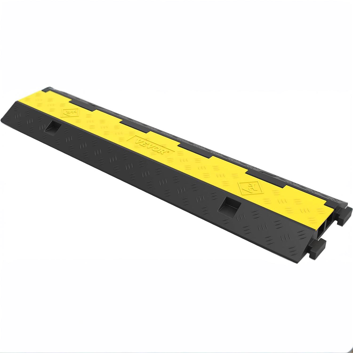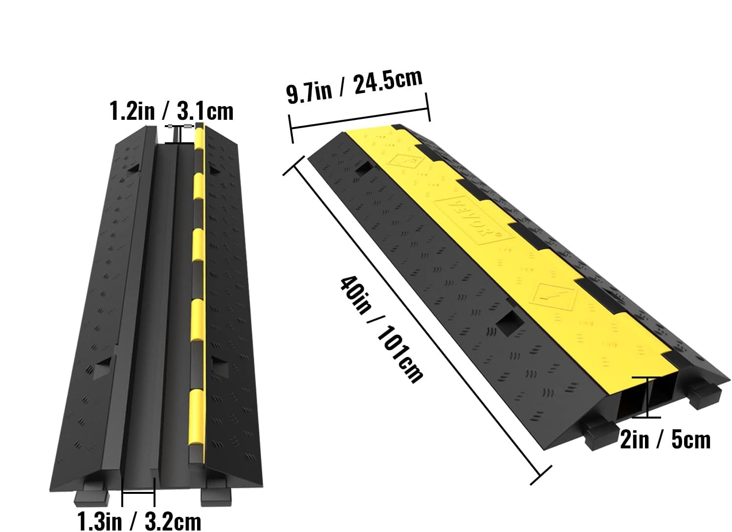Product size: 40” L x 9.7″ W x 2″ H/ 101 x 24.5 x 5 cm; Single channel size:1.3″ W x 1.2″ H/ 3.2 x 3.1 cm; 2 channels cables protector keeps various wires from getting damaged by foot traffic and vehicles. What’s more, the speed bump is ideal for slowing down the speed of cars to create a secure driving environment for roads, parking lots, and more.